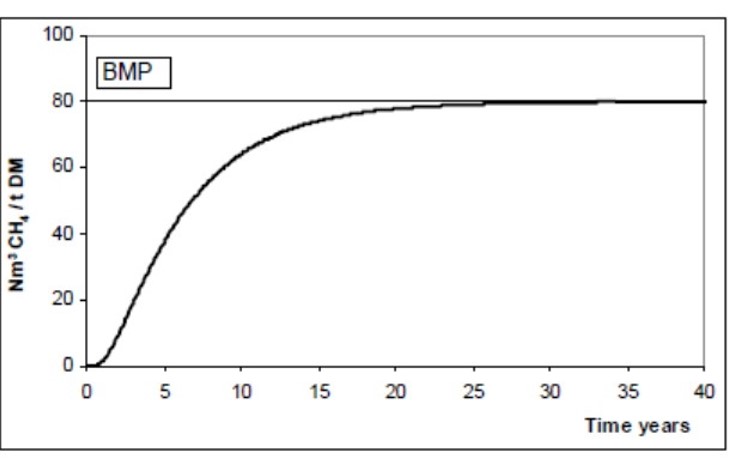 C'est au bout d'une trentaine d'années que quasiment tout le méthane issu de la décomposition des déchets bio dégradables est produit.